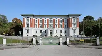 Ein repräsentativer Rechteckbau unter Flachdach mit einem ostseitigen Dachreiter. Die Westfassade wurde 1958 in reduzierten Formen erneuert.