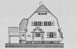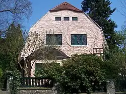 Der giebelständige Putzbau mit hohem, ziegelgedecktem Mansarddach und Krüppelwalm ist ein früher Vertreter der Heimatschutzarchitektur, möglicherweise auch des Reformstils.[2] In der nördlichen Seitenansicht steht ein Eingangsvorbau mit einem verbretterten Krüppelwalmgiebel. Auf der anderen Seitenansicht nach Süden zum Garten hin finden sich ein schmaler Vorbau sowie ein Zwerchgiebel im Dach. Auf der Gebäuderückseite steht ein Altan.