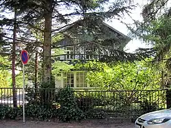 Auf der Giebelseite zur Straße befindet sich eine Terrasse, in den Traufseiten befinden sich Vorbauten und ein Balkon, unter diesem eine „holzsichtige Bohlenstube“.[2]