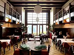 Den Innenraum dominiert eine zentrale, über zwei Geschoße reichende Halle, von der eine große Fensterfront einen weiten Ausblick über das Tal der Schwarza bis zum Schneeberg bietet. An der Rückseite ist eine Sitznische mit einem offenen Kamin eingerichtet. Eine an drei Seiten umlaufende Galerie erschließt die im ersten Stock gelegenen Zimmer.
