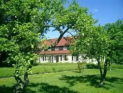 Weiterhin auffällig ist, dass das Haus genau nach den Himmelsrichtungen ausgerichtet ist. Die Gärten sind durch kleine Wege mit Buchsbaumhecken abgetrennt und ebenfalls symmetrisch angeordnet.