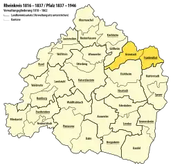 - ↑ Amtsblatt für das kön. baierische Gebiet auf dem linken Rheinufer vom 25. Juli 1816: Bekanntmachung vom 22. Juli 1816, Liste der zu den Kreisdirektionen gehörenden Kantone (bavarica.digitale-sammlungen.de)
