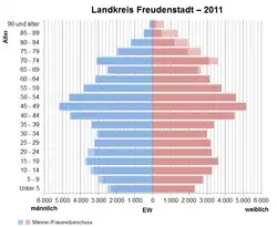 - ↑ Archivierte Kopie ( des vom 22. September 2021 im Internet Archive) Info: Der Archivlink wurde automatisch eingesetzt und noch nicht geprüft. Bitte prüfe Original- und Archivlink gemäß Anleitung und entferne dann diesen Hinweis. Datenbank Zensus 2011, Kreis Freudenstadt, Alter und Geschlecht