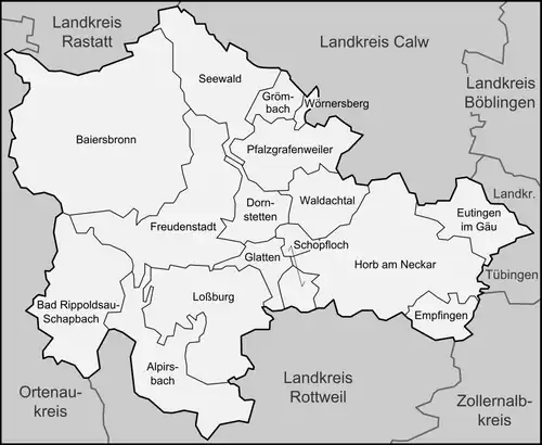 Bei der Kreisreform wurde am 1. Januar 1973 der Landkreis Horb aufgelöst. Sein nördliches Gebiet kam zum vergrößerten Landkreis Freudenstadt, der auch noch die Gemeinden Dießen und Empfingen des aufgelösten Landkreises Hechingen, die Gemeinden Peterzell und Römlinsdorf des Landkreises Rottweil und die Gemeinden Bad Rippoldsau und Schapbach des ebenfalls aufgelösten Landkreises Wolfach erhielt. Die Gemeinde Fünfbronn trat er an den Landkreis Calw ab.[4] Der südliche Teil des Landkreises Horb kam zum Landkreis Rottweil.