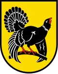 Blasonierung: „In Gold (Gelb) ein linksgekehrter balzender, rot bewehrter, schwarzer Auerhahn auf schwarzem Ast.“ |