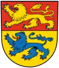 Blasonierung: „Rot und Gold geteilt, oben ein blaubewehrter, goldener Löwe, unten ein rotbewehrter, blauer Löwe, beide schreitend.“[8] |