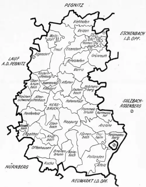 Der Landkreis Hersbruck gehörte zum bayerischen Regierungsbezirk Mittelfranken. Vor dem Beginn der bayerischen Gebietsreform am Anfang der 1970er Jahre umfasste der Landkreis 39 Gemeinden.[1]
