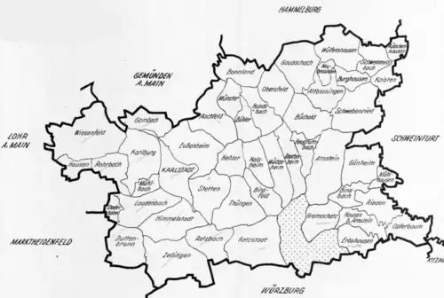 - Alle übrigen Gemeinden wurden mit Teilen der Landkreise Gemünden am Main, Lohr am Main und Marktheidenfeld zum Landkreis Main-Spessart (der bis zum 1. Mai 1973 als Landkreis Mittelmain bezeichnet wurde) zusammengelegt.[4] Kreisstadt wurde zunächst Lohr am Main, ab dem 1. Mai 1973 schließlich Karlstadt.