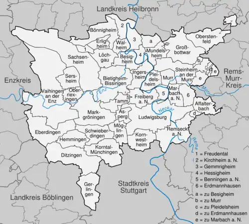 Bei der Kreisreform wurde der Landkreis Ludwigsburg am 1. Januar 1973 neu gebildet, dabei um etwa die Hälfte des Landkreises Vaihingen (die andere Hälfte kam zum Enzkreis) sowie um einige Gemeinden des Landkreises Leonberg und um die Gemeinde Affalterbach des Landkreises Backnang auf seinen heutigen Umfang vergrößert.[5]