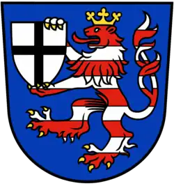 Das Wappen des Kreises zeigt im blauen Schild den neunmal von silber (weiß) und rot geteilten golden (gelb) bewehrten und gekrönten hessischen Löwen, der vor sich den Schild des Deutschen Ritterordens (silber mit durchgehendem schwarzen Kreuz) hält.