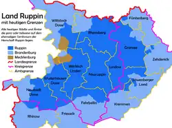 Karte der heutigen Ämter und Städte, die ganz oder teilweise im ehemaligen „Kreis Ruppin“ liegen.