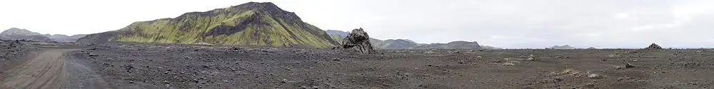 Diese sind Auswirkungen der Nähe eines aktiven Zentralvulkans, des Torfajökull. Aus graublauem Pechstein besteht der Vulkan Bláhnjúkur. Rötlich-braune Hänge (Rhyolithgestein oder Quarztrachyt) sind am Vulkan Brennisteinsalda zu finden, die auch streckenweise wegen Schwefel- und Kalkausfällungen graue, bläuliche und weiße Farbgebungen zeigen. Grüne Moose und weiße Schneereste, die selbst im Hochsommer vorhanden sind, setzen weitere Farbakzente. Ein schwarz glänzendes Obsidianlavafeld, das Laugahraun, reicht von den Solfataren an der Brennisteinsalda bis zum Fluss, an dem eine Hütte des Isländischen Wandervereins steht und wo in einem dampfenden Bach gebadet werden kann.