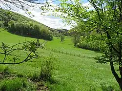 Laut Landschaftsplan handelt es sich bei den „Grünland-LSG“ um Gebiete, die neben den NSG zu den landschaftlich wertvollsten Teilen des Plangebietes gehören. Zum einen handelt es sich um Talauen und Unterhänge von Kerbtälern, die dem Biotopverbund der Fließgewässersysteme dienen und das Standortpotenzial für – meist feuchtigkeitsgeprägte – artenreiche Grünlandgesellschaften aufweisen. Zum anderen werden mit dieser Festsetzung einige magere Grünlandstandorte erfasst, die ebenfalls ein erhöhtes Arten- und Biotopschutzpotenzial aufweisen und als strukturreiche kleine Kulturlandschaftsausschnitte die umgebende, geringer strukturierte Landschaft bereichern. Insbesondere Fließgewässerabschnitte fallen häufig, wie bei diesem LSG, unter dem gesetzlichen Biotopschutz nach § 30 BNatSchG. Im LSG gilt ein Verbot einer dauerhaften Grünlandumwandlung in andere Nutzungsarten. Eine Erstaufforstung und eine Anlage von Weihnachtsbaumkulturen ist verboten.[2]