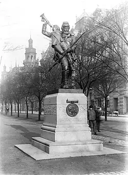 Die Statue zeigt einen vollausgestatteten Soldaten, mit kompletter Uniform, Rucksack, Schwert und Gewehr. Auf der Schulter trägt er einen kleinen Hornbläser, der in seiner rechten Hand ein Horn hält, in das er bläst. Der Hornbläser scheint auf dem Gewehr zu knien, das der Soldat mit beiden Händen hält. Rund um die Statue sind die folgenden Inschriften in das steinerne Fundament eingemeißelt.