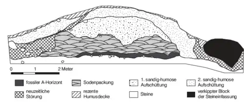 Der Schnitt 3 von 2 × 10 m wurde quer durch den Hügel angelegt um die Struktur zu klären. Es konnten mehrere Schichten differenziert werden, die von mehreren Bau- und Umbauereignisse zeugen. So wurde direkt über dem anstehenden Boden eine farblich inhomogene und stark humose Schicht von etwa einem Meter Mächtigkeit angetroffen, die als Packung aus Grassoden gedeutet wird. Diese Bauweise ist von vielen neolithischen und bronzezeitlichen Monumenten bekannt, wie z. B. vom Megalithgrab Wangels LA 69 in Ostholstein. Darüber wurde eine ebenfalls bis zu ca. ein Meter mächtige, hellere Schicht beobachtet. Diese beiden Aufschüttungen zusammen bilden den Kern der Hügelstruktur. Eine dritte Aufschüttung hat den Hügel nur wenig erhöht, hingegen in der Breite erweitert. Die ursprüngliche Breite des Hügels ist nicht zu ermitteln, da die Außenbereiche durch neuzeitliche Eingriffe gestört sind. In diesem gestörten Bereich liegen auch die wenigen erhaltenen Randsteine, ihre Position während der Ausgrabung entspricht somit nicht der Originalposition. In den gestörten Bereichen sind Brandspuren festzustellen, die im Zusammenhang mit dem Abbau der Steine stehen.