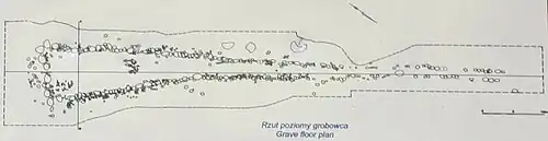 2 m hinter dem Eingang befindet sich ein Grab. Es ist rechteckig und von großen Steinen eingefasst. In dem Grab lag das Skelett eines Mannes. Der Tote lag direkt auf dem Boden in gestreckter Rückenlage entlang der Längsachse des Grabes mit dem Kopf nach Nordwesten. Die einzige Grabbeigabe war ein Feuerstein-Messer. Das Grab war mit Erde verfüllt und mit Rollsteinen abgedeckt.