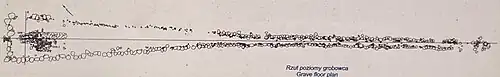 Unmittelbar nördlich hiervon wurde ein zweites Grab festgestellt. Es war ähnlich aufgebaut wie das erste, aber etwas kleiner und weniger sorgfältig ausgeführt. Es wies ebenfalls eine Bestattung in gestreckter Rückenlage mit dem Kopf im Nordwesten auf. Grabbeigaben konnten hier nicht festgestellt werden.
