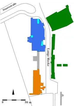 Das Gebiet von Kahl am Main weist eine große Funddichte an urnenfelderzeitlichen Fundstellen auf, die für Bayern außergewöhnlich ist.[12] In diesem Zusammenhang stehen auch die spätbronzezeitlichen Grab- und Siedlungsfunde der Langen Hecke. Neben drei Urnenbestattungen, die hangabwärts im südlichen Bereich der Grabungsfläche zwischen völkerwanderungszeitlichen Befunden entdeckt wurden, wurden hangaufwärts mindestens sechs Gebäudestrukturen anhand von Pfostenlöchern identifiziert. Darüber hinaus weisen Steinpflasterungen und Gruben (sowohl Vorrats-, Materialientnahme- als auch Schlitzgruben) auf Siedlungstätigkeiten im unteren Kahlgrund hin, die allgemein in die jüngere Urnenfelderzeit (Stufe Ha B) datiert werden können. Die Bauten weisen eine NW-SO-Orientierung auf und können anhand ihrer unterschiedlichen Grundflächen in zweischiffige Wohn- oder Stallbauten (Bau I-III), kleinere Wirtschaftsgebäude (Bau IV, VI) und einen quadratischen Speicherbau (Bau V) untergliedert werden. Vergleichbare architektonische Konstruktionen wurden auch in anderen offenen Siedlungen der Urnenfelderkultur in Hessen, Baden-Württemberg und Bayern beobachtet.[13]
