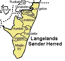 Die 284 km² große Insel Langeland gliederte sich ursprünglich in zwei Harden, die Nord- (Langelands Nørre Herred) und die Südharde (Langelands Sønder Herred) im Svendborg Amt, die mit der Kommunalreform 1970 von Nord nach Süd in drei historische Verwaltungsbezirke (Kommunen) aufgeteilt wurden, die zum damaligen Fyns Amt gehörten: