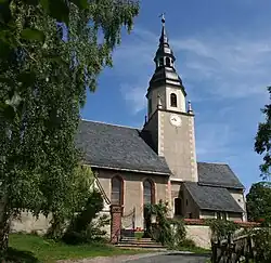 Die sich noch heute im Ort befindliche Kirche, ursprünglich eine Kapelle aus dem 13. Jahrhundert, ist im 15. Jahrhundert im Jahr 1467 erbaut worden. Sie hat einen sehr hohen Turm, der obere Teil über der Uhr wurde erst 1727 erbaut. Die Kirche hat ein gemaltes Deckengetäfel und auch die Emporen sind mit Gemälden aus der heiligen Geschichte versehen. Der Taufstein ist aus einem einzigen Stein gehauen. Zur Kirche gehören noch das Pfarrhaus, die Durchfahrt im Fachwerkbau und Pfarrgut mit Scheunengebäude. Alle diese Gebäude stehen unter Denkmalschutz.