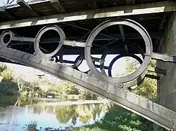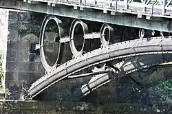 Die Brücke hat zwei flache Segmentbögen mit Spannweiten von 24,30 m. Das Tragwerk besteht aus drei hohlen, ovalen Gusseisenrohren, die sich an den Widerlagern und dem in der Mitte des Flusses stehenden, 2,30 m starken Steinpfeiler abstützen. Da es damals wesentlich leichter war, Rohrhälften als gebogene Rohre zu gießen, wurden Abschnitte aus linken und rechten Rohrhälften gefertigt und so versetzt zusammengefügt, dass das Ende eines Abschnitts in der Mitte des Abschnitts der anderen Rohrhälfte lag. Auf den Bögen befinden sich Ringe mit abnehmendem Durchmesser, die das Brückendeck stützen. Der Fahrbahnbelag besteht aus querverlegten Holzbohlen, das Geländer aus gusseisernen Andreaskreuzen.