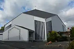 1967 wurde die heutige katholische Lantershofener Kirche geweiht und unter das Patrozinium des heiligen Lambert von Lüttich gestellt. Sie hat, basierend auf einem Entwurf des Architekten Josef Westermeier und angelehnt an die Hauskapelle der Weißen Schwestern zu Trier, eine fünfeckige Grundform und einen säulenfreien Innenraum. Als Seitentrakt der Kirche, vor der in einem Anbau befindlichen Sakristei, wurde eine Beicht- und Marienkapelle mit einer barocken Marienstatue integriert. Diese Statue war bereits in den beiden Vorgängerbauten der heutigen Kirche vorhanden. Erst im Folgejahr, 1968, wurde der freistehende zwanzig Meter hohe Kirchturm errichtet.[51] 1982 wurde ein ebenfalls noch aus den Vorgängerbauten in die heutige Kirche übernommenes Kruzifix restauriert. Hierbei stellte sich heraus, dass es sich nicht, wie zunächst angenommen, um eine Arbeit aus dem 18. Jahrhundert, sondern um ein mehrfach überstrichenes spätromanisches oder frühgotisches Kreuz aus dem 13. Jahrhundert handelt, das möglicherweise schon zur frühen Ausstattung der 1253 geweihten Kapelle gehörte.[45]