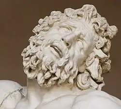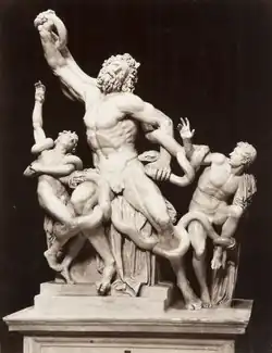 Der Laokoon-Mythos wurde in der antiken Kunst nur selten abgebildet. Von den wenigen Darstellungen ist die Laokoon-Gruppe die mit Abstand bekannteste. Sie zeigt den Priester auf einem Altar stehen, zu seinen beiden Seiten jeweils ein Sohn. Von der (vom Betrachter aus gesehen) rechten Seite werden die drei von zwei Schlangen angegriffen und völlig umwickelt. Einige moderne Betrachter interpretierten die Statue so, dass einer der beiden Söhne weniger hoffnungslos den Schlangen ausgeliefert ist und die Möglichkeit hat, sich zu retten.[1] Damit eng verbunden ist die Frage, auf welche schriftlichen Versionen die Laokoon-Gruppe Bezug nimmt: Sollten die Bildhauer eine Fassung verarbeitet haben, in der beide Söhne zu Tode kommen, wäre anzunehmen, dass sie die Fassung in der Aeneis des Vergil kannten, durch die diese Darstellung geprägt wurde. Dies wiederum würde bedeuten, dass die Laokoon-Gruppe nach der Aeneis entstanden ist, also frühestens im späten 1. Jahrhundert v. Chr. (Terminus post quem).