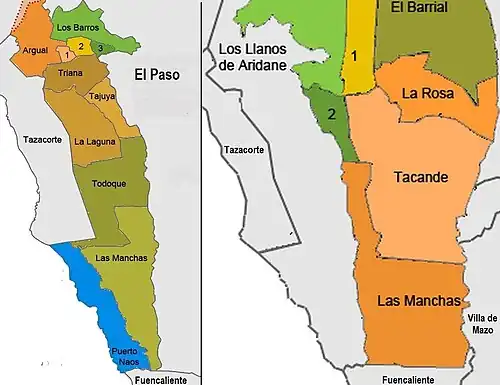Las Manchas (Die Flecken) ist der Name zweier Gemeindeteile (Barrios), einmal von Los Llanos de Aridane und nochmals von El Paso auf der Kanarischen Insel La Palma. Die Doppelung entstand 1837 aufgrund der Abtrennung der Gemeinde El Paso von der Gemeinde Los Llanos de Aridane.[1] Damals führte die Grenze zwischen den Gemeinden entlang des Camino Real,[2] aus dem mittlerweile die Straße LP-2 wurde. Zur Unterscheidung wird der verbliebene westliche Ortsteil seitdem Las Manchas de Abajo und der abgetretene östliche Teil San Nicolás (de las Manchas) genannt. Die relativ weit ausgedehnten und dünn besiedelten Barrios werden aber unterschiedslos Las Manchas genannt.