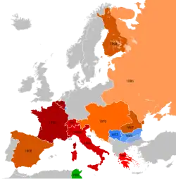 1795 führte Frankreich als zweite dezimale Währung nach dem US-Dollar den Franc zu 100 Centimes ein. Das Gewicht der Silbermünzen war so genormt, dass ein Franc genau 5 Gramm 900/1000-Silber, also 4,5 Gramm Feinsilber wog. Innerhalb des gleichen Währungssystems wurden auch Goldmünzen geprägt, wobei das Wertverhältnis von Silber und Gold auf 1:15,5 festgelegt wurde. Nach Italien wurde dieses System mit dem Italienfeldzug Napoleons (1796/97) gebracht. In der Schweiz bestand 1798 bis 1803 die Helvetische Republik; hier ließ Frankreich eine einheitliche Währung einführen (Schweizer Franken). 1803 ging die Münzhoheit an die Kantone zurück; nachdem 1848 die Schweiz ein Bundesstaat geworden war, war der Bund für die Währung zuständig. Mit dem «Bundesgesetz über das eidgenössische Münzwesen» vom 7. Mai 1850 wurde der Franken als Währung eingeführt; er orientierte sich am französischen (Silber-)Franc.
