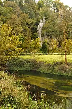 - An der engen, nur ca. 100 m breiten, Durchbruchstelle der südlichen Lauchert beim „Hertenstein“, (2,7 km S Jungnau); erkennbar an den südlich und nördlich als Talflanken stehenden Massenkalkfelsengruppen „Altes Schloss“/„Hertenstein“ und „Himbeertäle“ (beides geschützte Geotope).