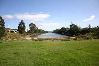 Im Norden der Stadt befindet sich der Single Hill, der einen Blick über Lauderdale bietet. Zu sehen ist der nahegelegene Sendemast von ABC Radio. An der Ralphs-Bay-Seite der Stadt (rechts) ist eine scharfe Linie zu erkennen, an der das Wasser seine Farbe wechselt. Sie ist besonders gut vom South Arm Highway (B33) aus zu sehen.
