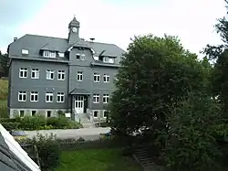 Die erste Schule von 1768 wurde 1849–1851 durch ein neues Schulhaus ersetzt, das später wiederum die Gewerbliche Berufsschule beherbergte und in dem von 1903 bis 2013 das Museum untergebracht war. 1868 wurde die „neue Schule“ errichtet, das heutige Rathaus. 1862 wurde eine Poststation und 1875 eine Telegrafenstation eingerichtet, am 1. Oktober 1886 das von der Firma Elias Greiner-Vetters-Sohn erbaute und an die Reichspost verpachtete Postgebäude feierlich seiner Benutzung übergeben.[15] 1889 besuchte der Herzog Georg II. von Sachsen-Meiningen die Glasbläsergemeinde, die wirtschaftlich aufstrebte, die aber auch immer wieder von Epidemien, wie Pocken, Scharlach, Masern, Ruhr und Keuchhusten, heimgesucht wurde. Auch das deutsche Kaiserhaus schätzte den Lauschaer Christbaumschmuck als überkonfessionelles Symbol nationalen Brauchtums im jungen Deutschen Reich. 1897 wurde die Bahnhofschule (ab 1949 „Goethe-Schule“), 1906 die Kirchwegschule eingeweiht. Seit 1902 hat Lauscha ein Trinkwasserleitungsnetz. Am 12. Juli 1902 wurde die am Vorabend erfolgte Gründung einer Freiwilligen Feuerwehr amtlich bekannt gemacht, die 1938/39 ein Löschgerätehaus bekam.[16] Die erste Dorfglashütte wurde 1905 abgerissen und machte einem entstehenden Ortskern Platz. Dieser erhielt mit der Einweihung der evangelischen Kirche nach 13-monatiger Bauzeit am 17. September 1911 an der Stelle einer kleinen barocken Kapelle, des „Kirchleins auf dem Berg“ aus dem Jahr 1732,[17] hoch über der Ortsmitte mit den kleinen beschieferten Bürgerhäusern sein heutiges Aussehen.