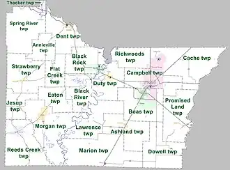 - ↑ Lawrence County (Arkansas). In: Geographic Names Information System. United States Geological Survey, United States Department of the Interior, abgerufen am 5. September 2024 (englisch).