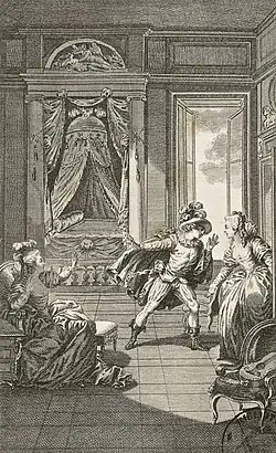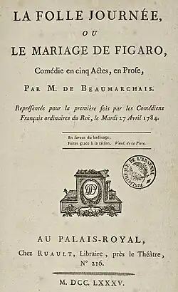 La folle journée ou Le mariage de Figaro (Der tolle Tag oder Figaros Hochzeit) ist eine Komödie in fünf Akten von Pierre-Augustin Caron de Beaumarchais (1732–1799). Sie bildet den zweiten Teil seiner Figaro-Trilogie[Anm 17] und diente als Vorlage zur Oper Le nozze di Figaro von Mozart und Da Ponte. Das Stück entstand vor der Französischen Revolution, als die Gesellschaftsordnung des Ancien Régime am Wanken war. Es illustriert den Konflikt zwischen dem Adel, der sich kraft seiner ererbten Privilegien über die bürgerliche Moral hinwegsetzte, und seinen unter dem Einfluss der Aufklärung selbstbewusster gewordenen Untergebenen. Der dem Dritten Stand (Bürgertum) entstammende Autor versetzte damit dem Zweiten Stand einen ähnlichen Schlag wie ein Jahrhundert zuvor Molière mit seinem Tartuffe dem Ersten Stand (Klerus). Le mariage de Figaro war laut Anton Bettelheim „ein Zeichen des sinkenden Ansehens des Königtums, eine (…) unerhörte Verhöhnung des Adels, der Zensur, des Stellenkaufes, einer unzuverlässigen, überlebten Justiz, eine Anklage aller despotischen Einschränkungen der persönlichen und Gedankenfreiheit“.[1]