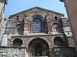 - Abteikirche St-Chaffre: Die heutige Kirche geht wahrscheinlich im Wesentlichen auf den Bau des Abtes Guillaume III. aus dem Jahre 1074 zurück: Die Fassade zeigt das übliche auvergnatisch-poitevinische Schema mit zwei – von großen Arkadenbögen plastisch durchgestalteten – Geschossen zuzüglich einem Dreiecksgiebel. Die Arkaden im Erdgeschoss sind gleich hoch, aber unterschiedlich breit; die Fensterarkade in der Mitte des Obergeschosses ist höher als die seitlichen Blendarkaden – eine derartige Konstellation ist auch als „Triumphbogenschema“ bekannt. Darüber hinaus zeigt die Fassade das für auvergnatische Kirchen typische Dekor (Schachbrettmuster, Sterne, Rautenfelder etc.) aus verschiedenfarbigen Steininkrustationen. Das Langhaus des – recht dunklen – Kircheninnern hat ein Rippengewölbe; auch der Chor wurde im 15. Jahrhundert im gotischen Stil (Spitzbogenarkaden, Rippengewölbe, Maßwerkfenster etc.) erneuert.[2]