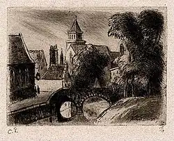 - ↑ Die Radierung wird gelegentlich auch als Das Musikantenufer in Brügge bezeichnet. Siehe Anne Röver: Camille Pissarro. S. 89. Für das Gemälde gibt es die teilweise Übersetzung Die Pont de la Clef in Brügge, Belgien. siehe Ulrike Aschoff, Gerhard Finckh: Camille Pissarro, der Vater des Impressionismus. S. 301.