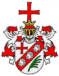 In Silber ein mit drei silbernen Pilgermuscheln belegter roter Schräglinksbalken, oben belegt von einem roten Tempelherrenkreuz, unten von einem grünen Palmzweig, der nach anderer Lesart auch ein Ölzweig sein kann. Auf dem Helm mit rot-silbernen Decken das Tempelherrenkreuz. Devise: ferme et fidèle.