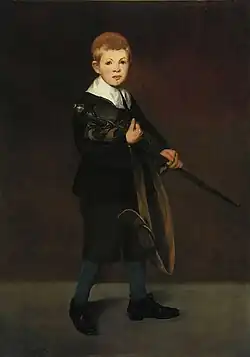 In dieser Zeit kopierte Manet im Louvre Werke seines bevorzugten spanischen Malers, Diego Velázquez. Andere Gemälde des Spaniers, wie etwa das Bildnis Infante Don Carlos, waren Manet als Reproduktionen aus der Veröffentlichung der Histoire des peintres de toutes les écoles von Charles Blanc bekannt.[12] Der Einfluss von Velázquez auf Manet wird besonders deutlich im 1861 entstandenen Gemälde Knabe mit Schwert. Der Dargestellte in diesem Bild trägt die spanische Mode des 17. Jahrhunderts und nimmt in seiner Ton-in-Ton-Malerei direkt auf Velázquez Bezug. Auffällig sind die Parallelen zum Bildnis Le petit Lange im direkten Blick des Knaben zum Bildbetrachter und in der Art und Farbe der Kleidung. In beiden Gemälden ist ein schwarz gekleideter Junge vor einem braunen Bildhintergrund zu sehen, wenn auch der Knabe mit Schwert insgesamt traditioneller gemalt ist, als der Le petit Lange. Bei dieser Ton-in-Ton-Malerei sehen Kunsthistoriker wie Gert Reising nicht nur den Einfluss von Diego Velázquez,[3] sondern sprechen wie Jan Lauts vom „spanischen Schwarz“ in der Farbgebung Manets.[13]