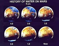 Vor etwa 3,8 Milliarden Jahren besaß der Mars eine dichtere Atmosphäre[36] und höhere Temperaturen sowie große Mengen fließenden Wassers[37][38][39][40], die auf seiner Oberfläche Ozeane ausbildeten.[41][42][43][44] Berechnungen zufolge könnten diese Ozeane einst 36 %[45] bis 75 %[46] der Oberfläche des Planeten bedeckt haben. Der Salzgehalt (die Salinität) der Ozeane wäre jedoch für die meisten irdischen Lebewesen zu hoch gewesen[47]. Das Halobacterium allerdings benötigt sogar einen sehr hohen Salzgehalt und hätte auch in den einstigen Mars-Ozeanen überleben können.[48]
