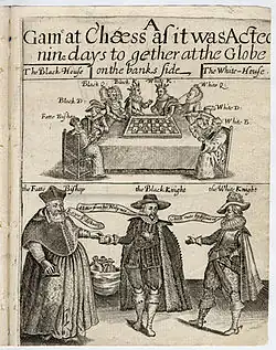 Das satirische Theaterstück A Game at Chess (deutscher Titel: Das Schachspiel), das 1624 im Globe Theatre aufgeführt wurde, zeigte bekannte zeitgenössische Politiker unter der Maske von Schachfiguren. In dem Werk wurde besonders der spanische Botschafter verhöhnt. Der politische Streit darüber führte zur Anklage, die beteiligten Schauspieler verurteilte das Gericht zu Geldstrafen, und der Autor Thomas Middleton musste sogar für einige Zeit ins Gefängnis.