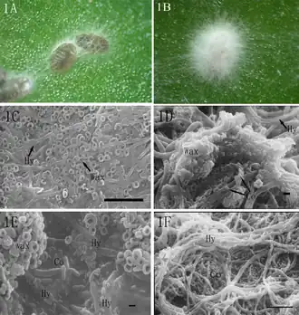 Hyphen auf der Nymphe von Phenacoccus fraxinus (1A) Anfangsstadium des Befalls (1B) Hyphen umgeben den gesamten Körper. (1C) Hyphen (Hy) dringen durch die Wachsfilamente (3000×, Balken = 10 μm). (1D) Hyphen (Hy) durchdringen das feuchte Wachs (4000×, Balken = 1 μm). (1E) Die intersegmentären Falten sind vom Konidien (Co) und Hyphen (Hy) befallen (5000×, Balken = 1 μm). (1F) Sporen zerstreut um die Hyphen (Hy) (2000×, Balken = 10 μm). | ||||||||||||