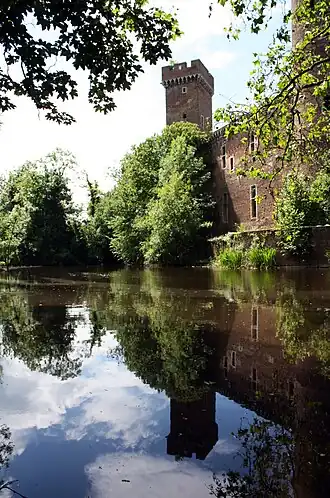 Im Jahre 1306 begann der Kölner Erzbischof Heinrich II. von Virneburg mit dem Wiederaufbau der Stadtbefestigung und Neubau einer Burg (Wohnturm) in der Nordostecke der heutigen Altstadt.[24] Das ergänzende Hochschloss entstand unter den Erzbischöfen Walram von Jülich und Wilhelm von Gennep. Die mächtige Burganlage bildete mit den sie umschließenden Wassergräben eine separate Festung innerhalb der befestigten Stadt.