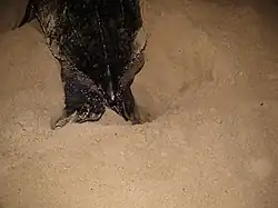Eine weibliche Lederschildkröte gräbt eine Erdkuhle zur Eiablage am Strand von Saint Croix.