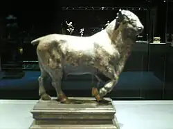Das rechteckige, 8 × 4 Meter große Dolichenum von Brigetio, das mit seiner Längsachse genau westöstlich orientiert war, wurde 1899 südlich des Legionslagers von dem Privatsammler Armin Milch ergraben.[36] Der Innenraum war durch drei aus Bruchsteinen aufgemauerte Säulen in zwei fast gleich große Bereiche aufgeteilt. Ob diese Säulen auch eine tragende Funktion erfüllten oder nur als Halbsäulen zur Aufstellung von Votivgaben dienten, ließ sich nicht mehr feststellen. Zwischen der mittleren und nördlichsten Säule fand sich eine bronzene Dolichenusstatuette. Vor dem einzigen, im Osten festgestellten Eingang standen ebenfalls drei Säulen, die mit einfachen Kapitellen ausgestattet waren. Das offensichtlich nicht geplünderte Heiligtum barg Weihinschriften, wie die eines aus Griechenland stammenden Dedikanten Valerius Hermes aus der 1. Hälfte des 3. Jahrhunderts.[37][38] Im westlichen Kultbereich fand sich das aus örtlichem Kalkstein gefertigte Relief des auf einem Stier reitenden Jupiter Dolichenus der in der Militärkleidung eines Imperators dargestellt wird. Laut Inschrift war die aus dem 2. oder 3. Jahrhundert stammende Arbeit ursprünglich von einem Decurio aus der kleinasiatischen Stadt Zeugma in Auftrag gegeben worden.[39] Zusätzlich zum Relief wurden weitere Darstellungen des Gottes in diesem Heiligtum aufgefunden, darunter auch solche, die von in Brigetio kaserniertem Militärpersonal gestiftet worden waren. Daneben konnten auch Bronzestatuetten anderer Götter geborgen werden, darunter zwei Exemplare der Siegesgöttin Victoria. Der Archäologe Endre Tóth mutmaßte, dass eine dieser Statuetten u. a. einst die Spitze einer dreieckigen Votivplatten verzierte,[40] wie dies am Dolichenum des rätischen Limeskastells Pfünz und beim Schatzfund von Mauer bei Amstetten nachgewiesen werden konnte. Der Schaft eines der Signumhalters, der von einer der beiden Siegesgöttinnen bekrönt wurde, kam gleichfalls aus dem Boden.[41] Auch Statuetten des Sonnengottes Sol und seiner Schwester, der Mondgöttin Luna wurden hier gefunden. Neben vielen weiteren, teils durch Feuer beschädigte bronzene Figürchen, Votivblechen und Kultmaterial wären auch eine Stier- und eine Vogelstatuette sowie ein gleichfalls aus Bronze gefertigter Siegerkranz bemerkenswert.[42]