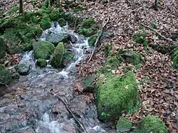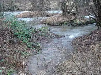 Der rechte Teilarm des Lehngrundbachs (vorne) mündet in die verzweigte Lohr | ||