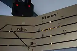 Bahnhof Linksdorf: Der Bahnhof Linksdorf wird von einem Fahrdienstleiterstellwerk Lf (Linksdorf-Fahrdienstleiter) und einem Wärterstellwerk Lo (Linksdorf-Ost) bedient. Er verfügt über drei Hauptgleise und ein Nebengleis. Außerdem sind hier das Hilfstriebfahrzeug und die Schiebelokomotive beheimatet, die bei bestimmten Programmabläufen gefahren werden können. Die hierfür benötigten Programme sind fest in der Relaisanlage einprogrammiert und erfordern einen unbedingt einzuhaltenden Ablauf in der Bedienung. Beide Stellwerke sind von der Einheitsbauart aus der Maschinenfabrik Esslingen mit einem Streckenblock der Bauform C. Im Fahrdienstleiterstellwerk ist die Weiche 3 als Handweiche (mechanisch ortsgestellt) ausgeführt und per Bankschloss mit dem Verschlusskasten verbunden. So lässt sich demonstrieren, dass auch mechanisch ortsgestellte Weichen ohne großen Aufwand in ein Stellwerk einbinden lassen. Als weitere Besonderheit ist für Einfahrten vom Einfahrsignal aus Richtung Mittelstadt zur Zustimmungsabgabe durch den Weichenwärter Lo stets eine fernmündliche Verständigung per Fernsprecher nötig. Das Wärterstellwerk Lo hat einen Streckenblock der Bauform C in Richtung der zweigleisigen Strecke nach Rechtsheim über Blockstelle Mitte. Es kann ein zeitweise eingleisiger Betrieb in Richtung Rechtsheim eingerichtet werden.