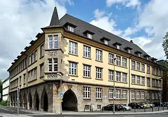 | Historischer Teil des Schulgebäudes der heutigen Gottfried-Wilhelm-Leibniz-Gesamtschule gegenüber der Abtei (2012) | |