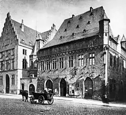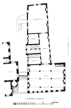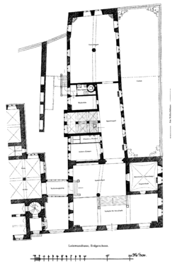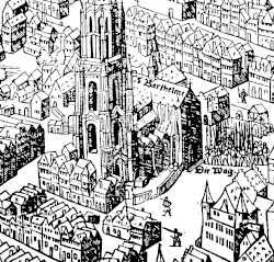 - ↑ Ratsverordnung vom 21. August 1399: Die rede sind ubirkommen, daz man alle lynwat, garn, flasz und hanff uszwendig der messe in der stede furen sulle und davon messegelt und huszgelt geben, als sich davon geburt. Auch inwendig der messe so mag man die obengenante kauffmanschafft in anderen husern feil han, also wan die kauffmannschafft virkauft wirt, daz man dann die linwat in der stede hus furen sulle und sie darinne messen und sal der stadt huszgelt und messegelt davon geben, so umb daz garn, flasz und hanff sal man wiegen in der stede wagen und der stat davon auch huszgelt und wigegelt geben. Auch sal nyman ubir ein hundert linwads messen dann der gesworn messer.