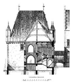 Architektonisch tritt dieser ursprüngliche Bau trotz schwerer Schäden im Zweiten Weltkrieg bis heute unverändert auf. Das als Bruchsteinbau konstruierte, zweigeschossige Leinwandhaus zeigt alle Merkmale profaner hochgotischer Architektur – um das steil aufragende Walmdach, das drei Dachgeschosse beherbergt, verläuft ein funktionaler, von Zinnen umschlossener Wehrgang mit vier polygonalen, zweigeschossigen Ecktürmchen, unterhalb des Wehrgangs ein das gesamte Gebäude umlaufender Dreipass-Fries.