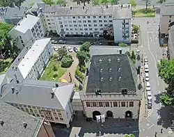 Von 1980 bis 1983 wurde das Gebäude äußerlich größtenteils originalgetreu (vgl. Bilder) rekonstruiert. Einzig der weitläufige, im Krieg stark zerstörte südliche Anbau wurde aufgegeben. Stattdessen integrierte man an der Südseite einen modernen, barrierefreien Treppenanbau in den Bau. Über seine Form hatte es noch 1980 Meinungsverschiedenheiten gegeben. Entgegen den Vorstellungen Giefers, der für ein gläsernes Treppenhaus eintrat, entschied sich der Magistrat für eine Steinkonstruktion mit an den Ursprungsbau erinnernden Fenstern. Die einzige Kupferstatue, die den Krieg unzerstört überstand, wurde nach Restauration durch den Bildhauer Edwin Hüller wieder an ihrem angestammten Platz in der Nordwestecke aufgestellt.